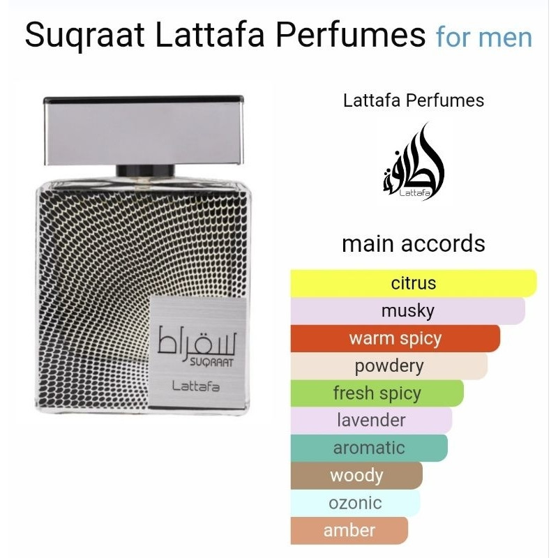 Suqraat Eau De Perfume by Lattafa. Is a Aromatic fragrance for men. This is a new fragrance. Suqraat Eau De Perfume was launched in 2022. Head notes are Bergamot and Ginger; Depth notes are Lavender and Violet